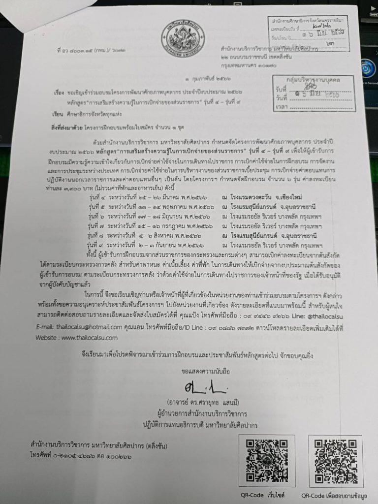 ด้วยสำนักงานบริหารวิชาการ มหาวิทยาลัยศิลปากร จัดโครงการพัฒนาศักยภาพบุคลากร ประจำปี 2566 หลักสูตร “การเสริมสร้างความรู้ในการเบิกจ่ายของส่วนราชการ” รุ่นที่ 4 – รุ่นที่ 9 หากท่านใดสนใจสามารถสอบถามรายละเอียดหรือสมัครเข้าร่วมได้ตามเอกสารที่แนบมาพร้อมนี้ Share: Previous Post พิธีถวายสัตย์ปฏิญาณเพื่อเป็นข้าราชการที่ดี Next Post ประชุม อ.ก.ค.ศ. เขตฯ ครั้งที่ 8/2566 Related Articles ข่าวประชาสัมพันธ์ ประกาศสำนักงานเขตพื้นที่การศึกษาประถมศึกษานครราชสีมา เขต 3 เรื่อง รายชื่อผู้ผ่านการคัดเลือกบุคคลเพื่อจ้างเหมาเป็นลูกจ้างชั่วคราว ตำแหน่งนักการภารโรง สังกัดสำนักงานเขตพื้นที่การศึกษาประถมศึกษานครราชสีมา เขต 3 ข่าวประชาสัมพันธ์ ประกาศการขึ้นบัญชีและการยกเลิกบัญชีผู้สอบแข่งขันได้ ตำแหน่งครูผู้ช่วย สังกัด สพฐ. ปี พ.ศ.2566 ข่าวประชาสัมพันธ์ การอบรมสัมมนาวิชาการและประชุมใหญ่สามัญประจำปี พ.ศ.2563 ข่าวประชาสัมพันธ์ การขึ้นบัญชีผู้สอบแข่งขันได้ กรณีการนำรายชื่อผู้สอบแข่งขันได้ในบัญชีหนึ่งไปขึ้นบัญชีเป็นผู้สอบแข่งขันได้ในบัญชีอื่น เพื่อบรรจุและแต่งตั้งเข้ารับราชการเป็นข้าราชการครูและบุคลากรทางการศึกษา ตำแหน่งครูผู้ช่วย ข่าวประชาสัมพันธ์ การรับย้าย(กรณีปกติ) การโอนข้าราชการครูและบุคลากรทางการศึกษา การโอนพนักงานส่วนท้องถิ่นและ ข้าราชการอื่น ตำแหน่งศึกษานิเทศก์ มาดำรงตำแหน่งศึกษานิเทศก์ ในตำแหน่งที่ว่าง