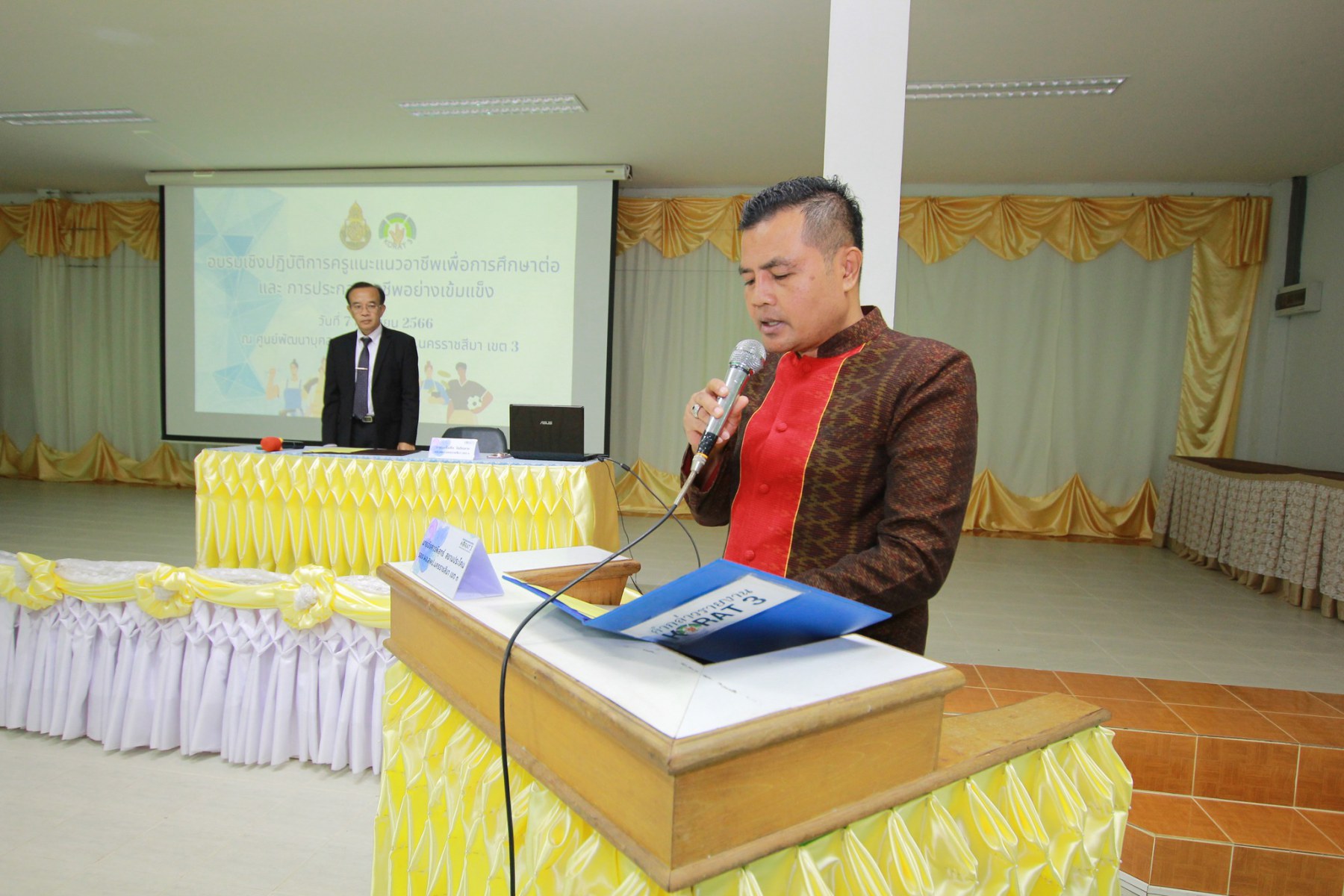 วันที่ 7 กันยายน 2566 เวลา 10.30 น. นายเผด็จศึก โชติกลาง ผอ.สพป.นครราชสีมา เขต 3 ประธานเปิดการอบรมอบรมเชิง ปฏิบัติการครูแนะแนวอาชีพเพื่อการศึกษาต่อและการประกอบอาชีพอย่างเข้มแข็ง ณ ศูนย์พัฒนาบุคลากรทาบงการศึกษา อ่างหิน อำเภอปักธงชัย จังหวัดนครราชสีมา ด้วย สำนักงานคณะกรรมการการศึกษาขั้นพื้นฐาน ได้มีนโยบายในปีงบประมาณ 2566 วิถีคุณภาพ 4 ด้าน ได้แก่ ด้านความปลอดภัย ด้านโอกาส ด้านคุณภาพ และด้านประสิทธิภาพ ซึ่งด้านคุณภาพเน้นการจัด การศึกษาให้ผู้เรียนมีทักษะที่จำเป็นในศตวรรษที่ 21 นำาไปสู่การมีอาชีพ มีงานทําและเพิ่มขีดความสามารถในการ แข่งขัน จุดเน้นของสำนักงานคณะกรรมการการศึกษาขั้นพื้นฐาน ในการเร่งแก้ปัญหากลุ่มผู้เรียนที่ได้ผลกระทบจาก สถานการณ์แพร่ระบาดของโรคโคริต – 19 โดยเพิ่มโอกาสในการเข้าถึงการศึกษา ฟื้นฟูภาวะถดถอยทางการเรียนรู้ (Lerning Loss Recovery) ให้กับผู้เรียนทุกระดับ กอปรกับสถานการณ์และการเปลี่ยนแปลงในปัจจุบันทีส่งผลกระทบ ต่อนักเรียนทั้งทางตรงและทางอ้อม ทำให้นักเรียนมีความต้องการในการดูแลด้านสุขภาพจิตมากยิ่งขึ้น