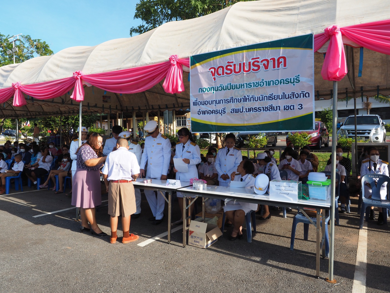 วันที่ 23 ตุลาคม 2566 เวลา 08.00 น. นางนภาพรรณ นาดี ผู้อำนวยการสำนักงานเขตพื้นที่การศึกษาประถมศึกษานครราชสีมา เขต3 พร้อมด้วยผู้บริหารสถานศึกษา คณะครู เจ้าหน้าที่และบุคลากรในสำนักงานงานเขตพื้นที่การศึกษาประถมศึกษานคราชสีมา เขต3 ร่วมกับหัวหน้าส่วนราชการ ข้าราชการพลเรือน พนักงานรัฐวิสาหกิจ องค์กรปกครองส่วนท้องถิ่น ภาคเอกชน และประชาชนชาวอำเภอครบุรี โดยมีนายนายพีรวัฒน์ ธีระวัฒนา นายอำเภอครบุรี ประธานในพิธีวางพวงมาลา เบื้องหน้าพระบรมราชานุสาวรีย์ พระบาทสมเด็จพระจุลจอมเกล้าเจ้าอยู่หัว รัชกาลที่ 5 เนื่องในวันคล้ายวันสวรรคต พระบาทสมเด็จพระจุลจอมเกล้าเจ้าอยู่หัว หรือวันปิยมหาราช เพื่อน้อมรำลึกถึงพระมหากรุณาธิคุณอันยิ่งใหญ่ของพระบาทสมเด็จพระจุลจอมเกล้าเจ้าอยู่หัว รัชกาลที่ 5 เสร็จจากพิธีดังกล่าว เป็นการมอบทุนการศึกษาจากกองทุนวันปิยะมหาราชอำเภอครบุรี จำนวน 60 ทุน ให้กับนักเรียนทุกสังกัดในอำเภอครบุรี ณ หน้าที่ว่าการอำเภอครบุรี จังหวัดนครราชสีมา