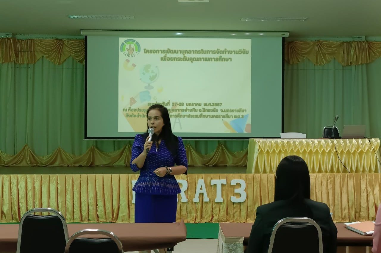 นางนภาพรรณ นาดี ผู้อำนวยการสำนักงานเขตพื้นที่การศึกษาประถมศึกษานครราชสีมา เขต 3 มอบหมายให้นางสาวมยุรีย์ เนตรศิลานนท์ รองผู้อำนวยการสำนักงานเขตพื้นที่การศึกษาประถมศึกษานครราชสีมา เขต 3 ประธานเปิดการอบรมพัฒนาตามโครงการพัฒนาบุคลากรในการจัดทำงานวิจัยเพื่อยกระดับคุณภาพการศึกษา พร้อมด้วย นางเกดสุชา ทองน้อย ผู้อำนวยการกลุ่มพัฒนาครูและบุคลากรทางการศึกษา ผู้อำนวยการสถานศึกษาและคณะครู จัดอบรมพัฒนาตามโครงการพัฒนาบุคลากรในการจัดทำงานวิจัยเพื่อยกระดับคุณภาพการศึกษาสังกัดสำนักงานเขตพื้นที่การศึกษาประถมศึกษานครราชสีมา เขต 3 เมื่อวันที่ 27 มกราคม 2567 ณ ห้องประชุมศูนย์พัฒนาบุคลากรอ่างหิน อ.ปักธงชัย จ.นครราชสีมา โดยมีวัตถุประสงค์เพื่อพัฒนาบุคลากรในสังกัดให้มีความรู้ความเข้าใจเกี่ยวกับการจัดทำการวิจัยทางการศึกษามีทักษะกระบวนการในการจัดทำงานวิจัยทางการศึกษามีเจตคติที่ดีต่องานวิจัยและเพื่อให้สถานศึกษาและสำนักงานเขตพื้นที่การศึกษา มีงานวิจัยเพื่อนำมาพัฒนาคุณภาพการศึกษา