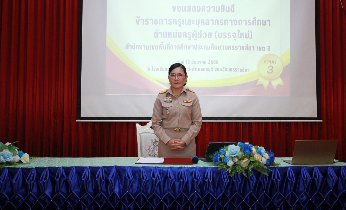 เมื่อวันที่ 13 ธันวาคม 2566 นางนภาพรรณ นาดี ตำแหน่งผู้อำนวยการสำนักงานเขตพื้นที่การศึกษารประถมศึกษานครราชสีมา เขต 3 ประธานในพิธีประดับอินทรธนูและปฐมนิเทศข้าราชการครูและบุคลากรทางการศึกษา ตำแหน่งครูผู้ช่วย บรรจุใหม่ สังกัดสำนักงานเขตพื้นที่การศึกษาประถมศึกษานครราชสีมา เขต 3 พร้อมด้วยนางสาวมยุรีย์ เนตรศิลานนท์ รองผอ.สพป.นครราชสีมา เขต3 เจ้าหน้าที่กลุ่มบริหารงานบุคคล เพื่อสร้างขวัญกำลังใจ พัฒนาครูผู้ช่วย ให้มีความรู้ มีความประพฤติ และคุณลักษณะเหมาะสม ในหน้าที่ ตามมาตรฐานตำแหน่ง ที่ ก.ค.ศ.กำหนด และสามารถนำไปประยุกต์ใช้ในการปฏิบัติงาน สู่ครูมืออาชีพ เพื่อรับทราบทิศทางนโยบายของรัฐบาล กระทรวงศึกษาธิการ สำนักงานคณะกรรมการการศึกษาขั้นพื้นฐาน และสำนักงานเขตพื้นที่การศึกษาประถมศึกษานครราชสีมา เขต 3 ซึ่งสำนักงานเขตพื้นที่การศึกษาประถมศึกษานครราชสีมา เขต 3 ได้เรียกบรรจุข้าราชการครูตำแหน่งครูผู้ช่วย ประกอบด้วย วิชาเอกเอกคณิตศาสตร์ วิชาเอกภาษาไทย วิชาเอกภาษาอังกฤษ วิชาเอกปฐมวัย วิชาเอกพลศึกษา วิชาเอกวิทยาศาสตร์ วิชาเอกศิลปศึกษา และ วิชาเอกสังคมศึกษา รวมทั้งสิ้น 26 ราย ณ ห้องประชุมอาคารคุ้มเกล้า โรงเรียนอนุบาลครบุรี อำเภอครบุรี จังหวัดนครราชสีมา