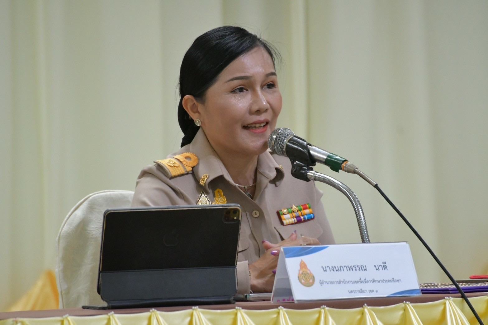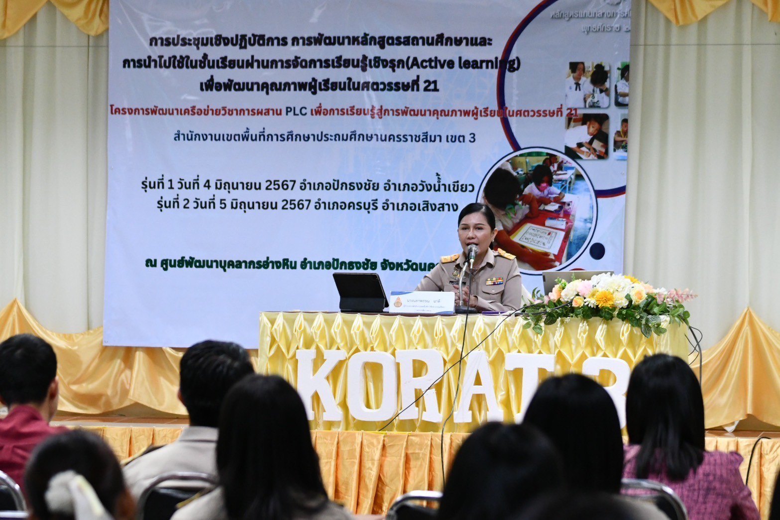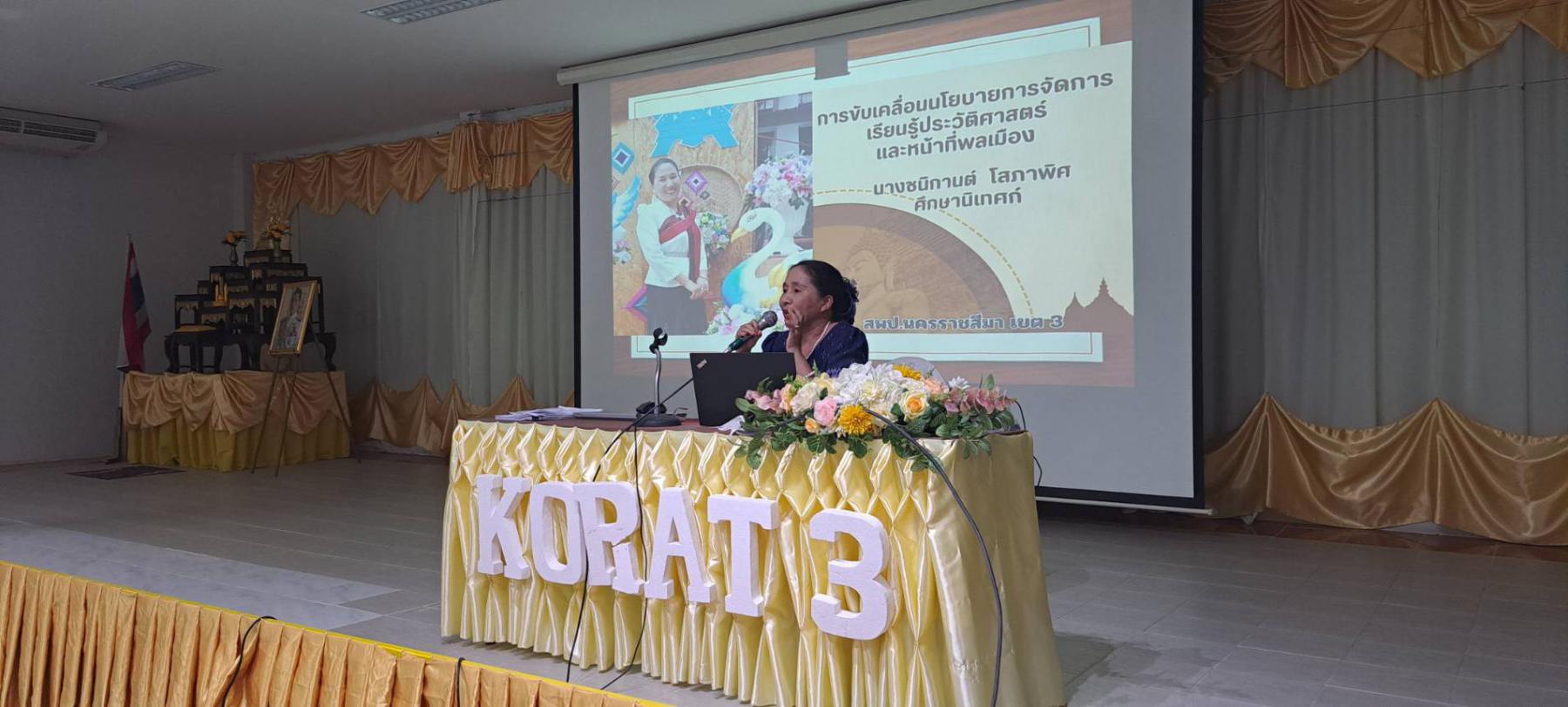 เมื่อวันที่ 4 มิถุนายน 2567 นางนภาพรรณ นาดี ผู้อำนวยการสำนักงานเขตพื้นที่การศึกษาประถมศึกษานครราชสีมา เขต 3 มอบหมายให้ นางสาวมยุรีย์ เนตรศิลานนท์ รองผู้อำนวยการสำนักงานเขตพื้นที่การศึกษาประถมศึกษานครราชสีมา เขต 3 นางพัชราภรณ์ พินิจพงศ์ ผอ. กลุ่มนิเทศ ติดตามและประเมินผลการจัดการศึกษา และคณะศึกษานิเทศก์ ครูแกนนำ ดำเนินการประชุมเชิงปฏิบัติการพัฒนาหลักสูตรสถานศึกษาและการนำไปใช้ในชั้นเรียนผ่านการจัดการเรียนรู้เชิงรุก(Active Learning) เพื่อพัฒนาคุณภาพผู้เรียนในศตวรรษที่ 21 การจัดการเรียนการสอนประวัติศาสตร์ในสถานศึกษา โดยมีครูวิชาการโรงเรียนใน อำเภอปักธงชัยและอำเภอวังน้ำเขียวเข้าร่วมอบรม ณ ศูนย์พัฒนาครูและบุคลากรทางการศึกษา อ่างหิน