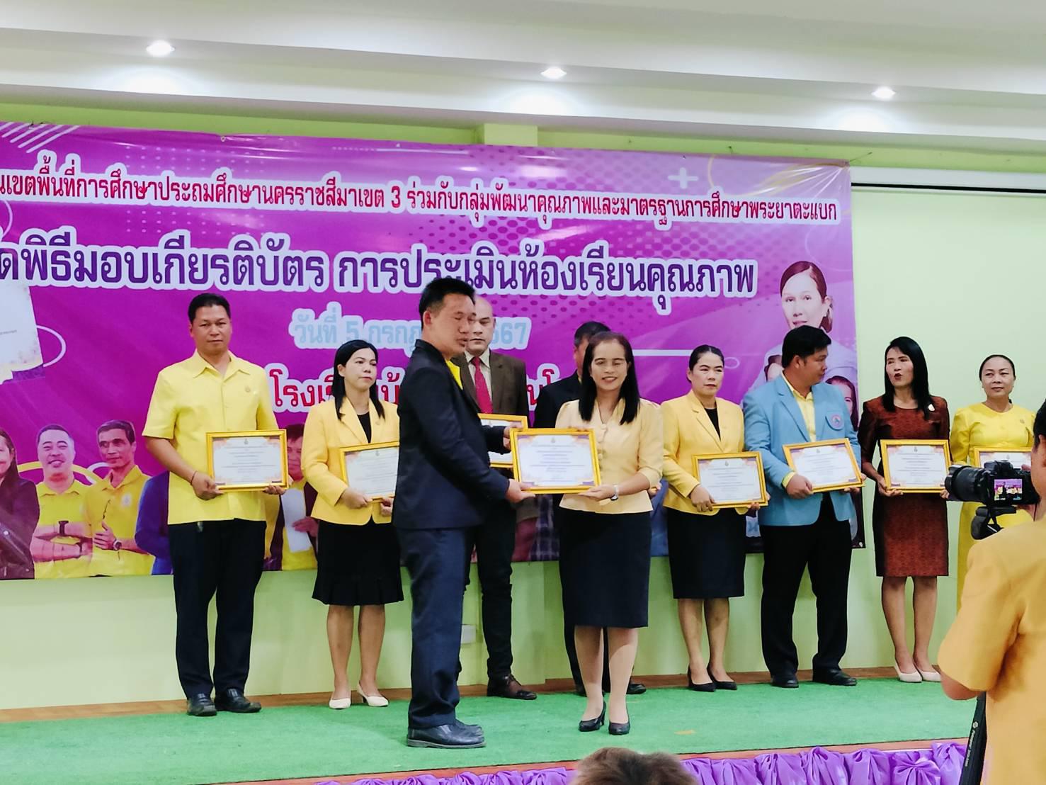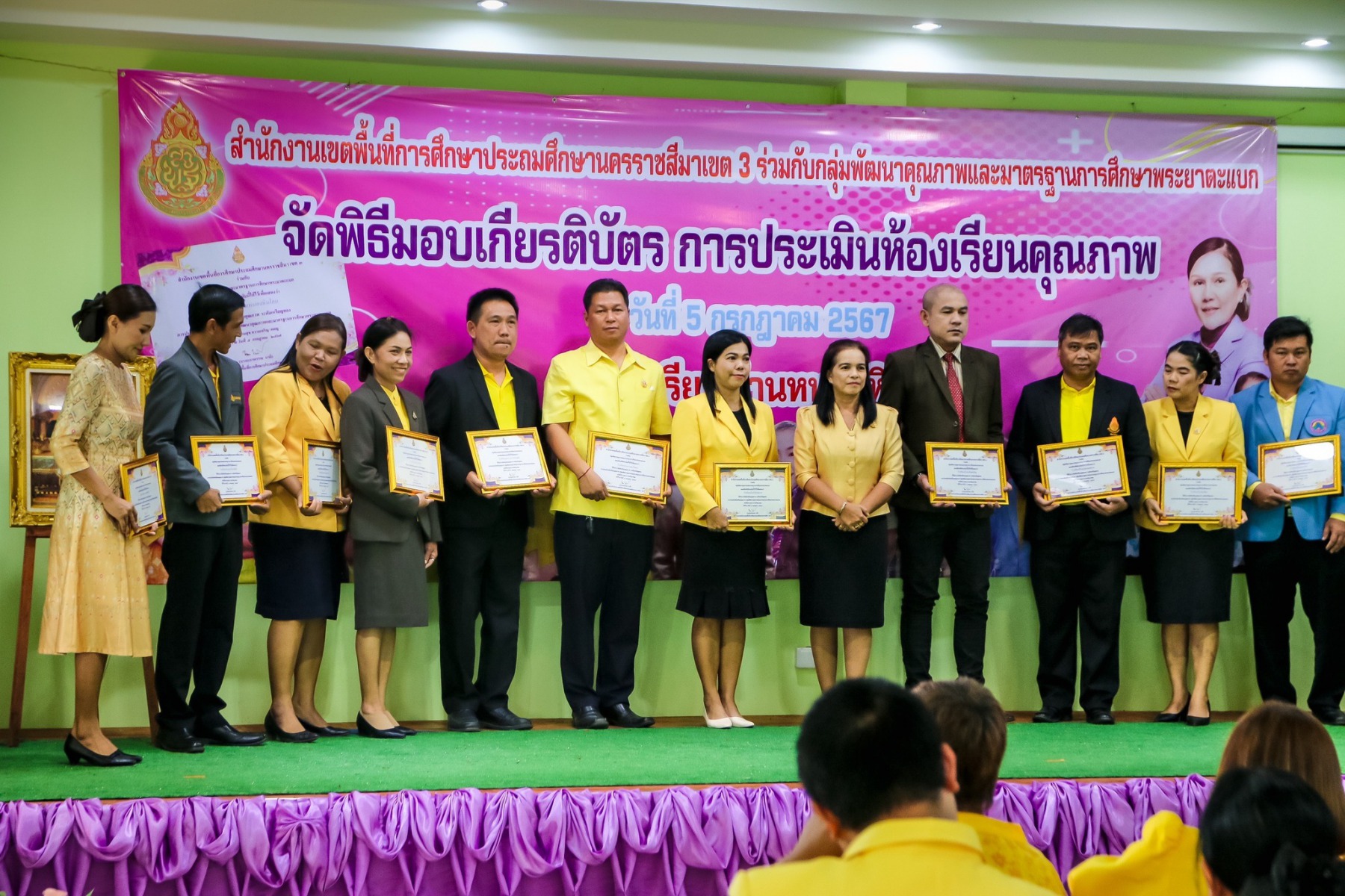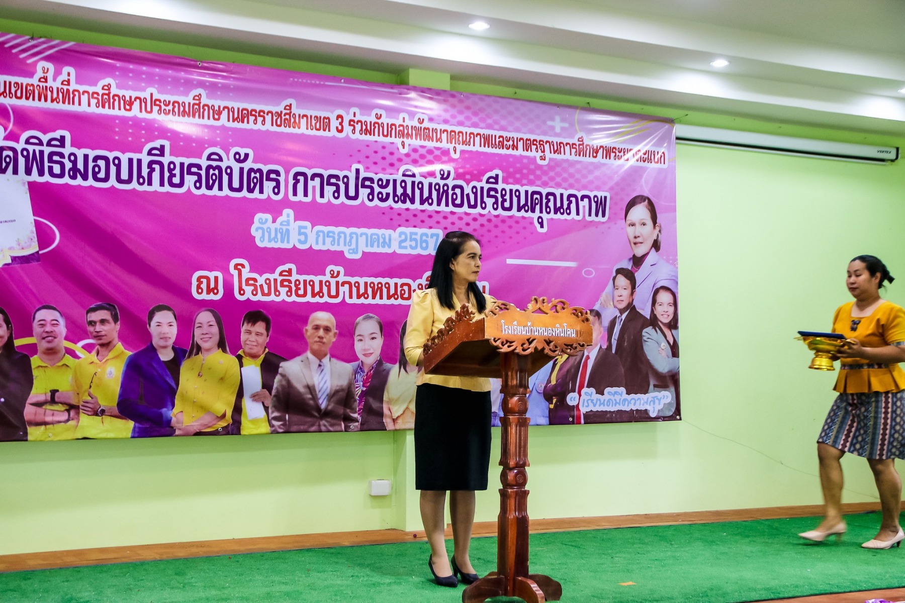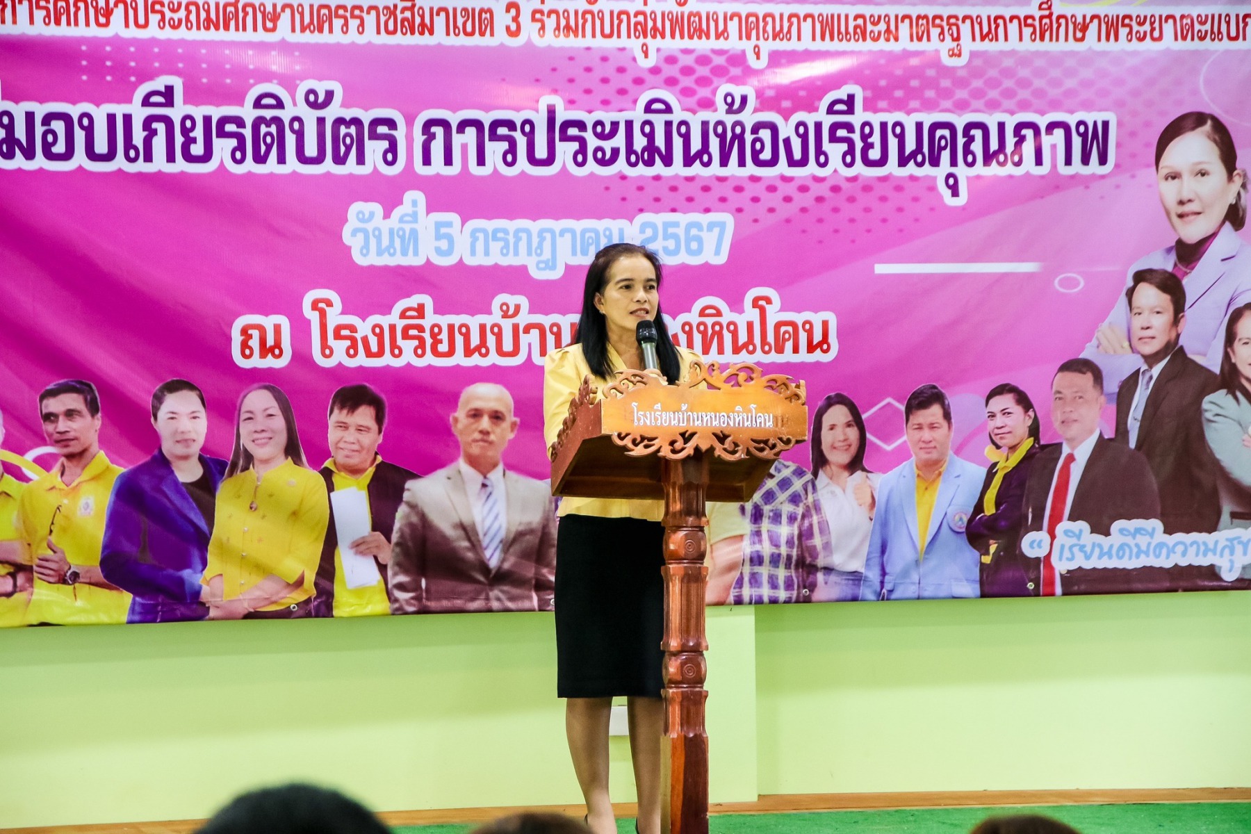 เมื่อวันที่ 5 มิถุนายน 2567 นางนภาพรรณ นาดี ผู้อำนวยการสำนักงานเขตพื้นที่การศึกษาประถมศึกษานครราชสีมา เขต 3 มอบหมายให้ นางสาวมยุรีย์ เนตรศิลานนท์ รองผู้อำนวยการสำนักงานเขตพื้นที่การศึกษาประถมศึกษานครราชสีมา เขต 3 ประธานเปิดกิจกรรม “พิธีมอบเกียรติบัตรแก่ผู้ผ่านการประเมินห้องเรียนคุณภาพตามโครงการ “ห้องเรียนน่าอยู่ คุณครูน่ารัก” และการประชุมกลุ่มพัฒนาคุณภาพและมาตรฐานการศึกษาพระยา ตะแบก” พร้อมด้วยนางสาวสุปรีดา สถิตธรรมรัตน์ นายเฉลิมรัฐ วงษ์วัฒนะ ศึกษานิเทศก์ ณ โรงเรียนบ้านหนองหินโคน อ.ครบุรี จ.นครราชสีมา