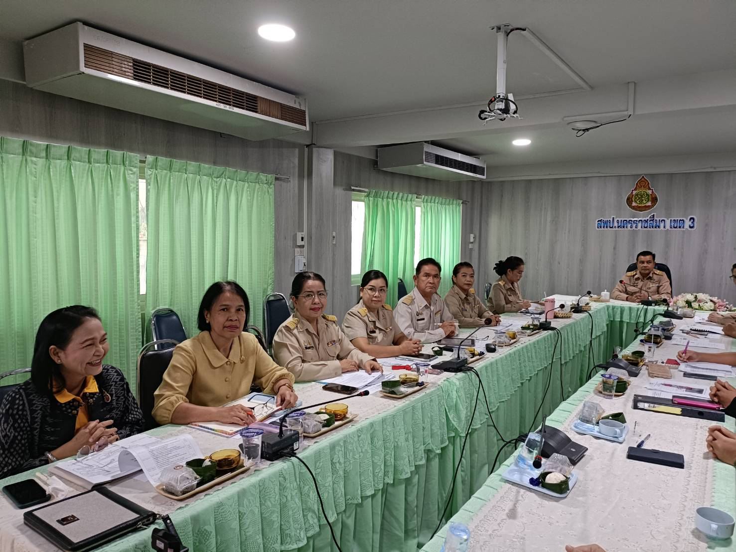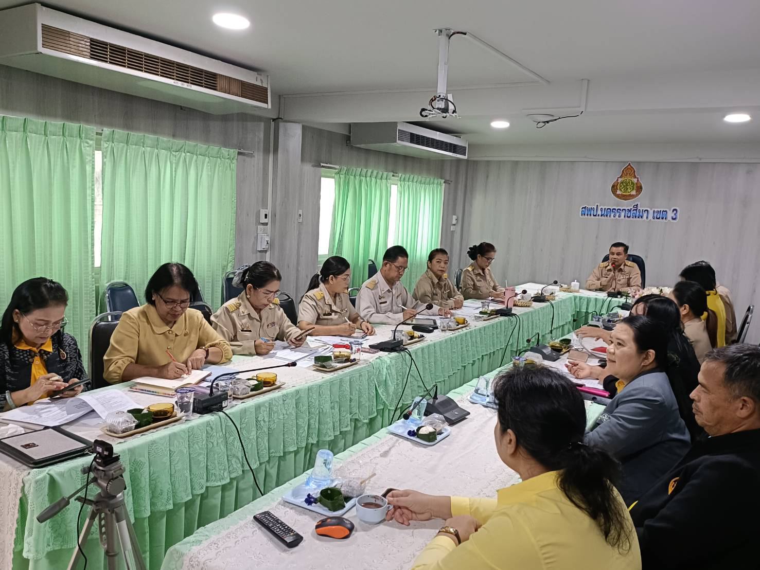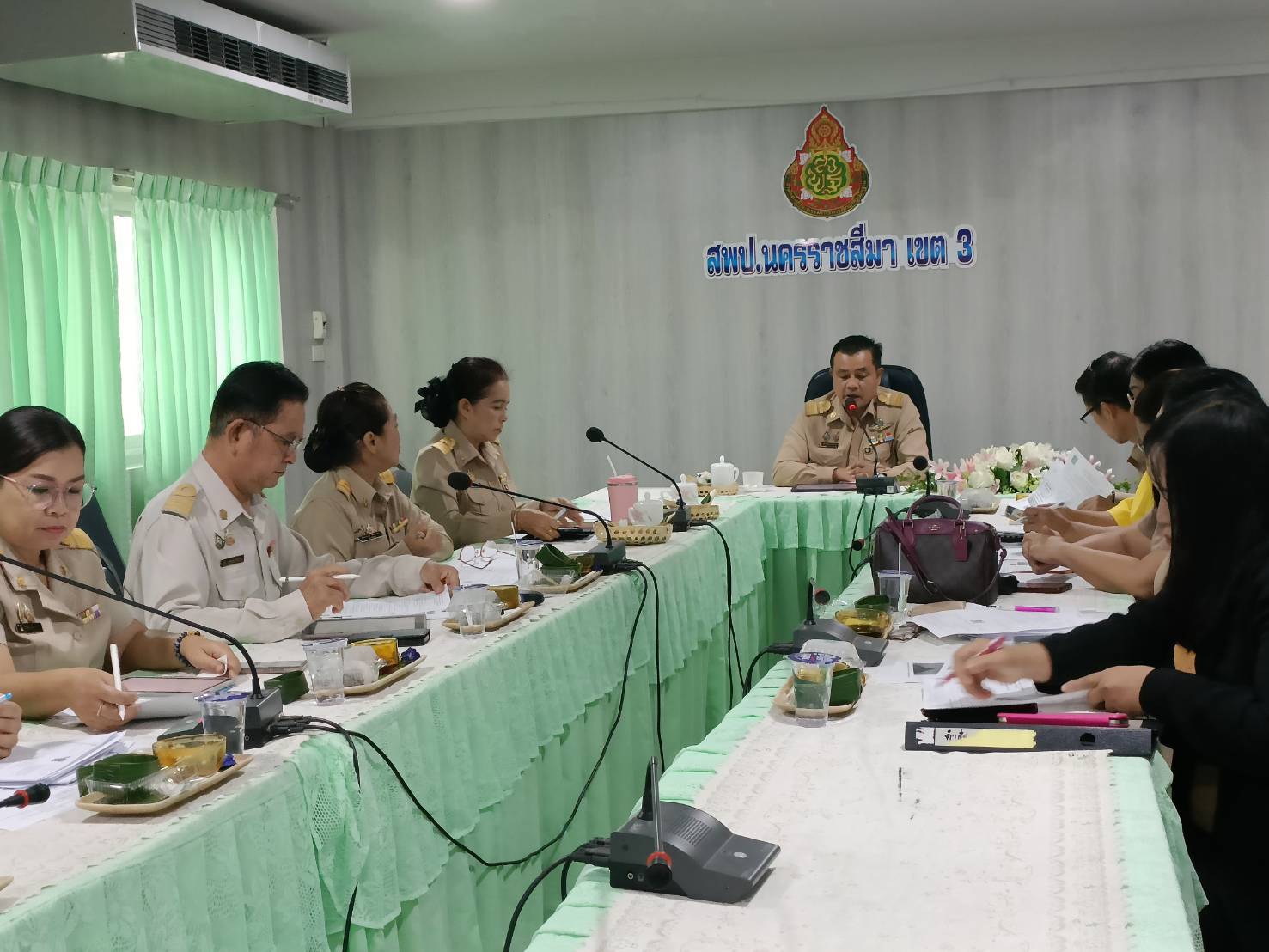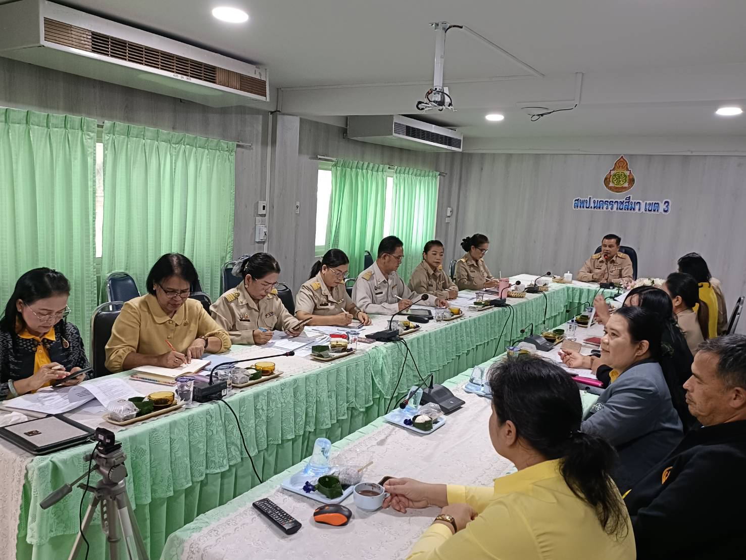 เมื่อวันที่ 11 กรกฎาคม 2567 นางนภาพรรณ นาดี ผู้อำนวยการสำนักงานเขตพื้นที่การศึกษาประถมศึกษา นครราชสีมา เขต 3 มอบหมายให้นายอังคารพิสุทธ์ สยามประโคน รองผอ.สพป.นครราชสีมา เขต 3 พร้อมด้วย นางสาวมยุรีย์ เนตรศิลานนท์ รองผอ.สพป.นครราชสีมา เขต 3 ผู้อำนวยการกลุ่ม/ผู้อำนวยการหน่วยและบุคลากรทางการศึกษาเข้าร่วมรับชมรายการพฤหัสเช้า ข่าวสพฐ. ครั้งที่ 28/2567 ในวันพฤหัสบดีที่ 11 กรกฎาคม 2567 เพื่อรับฟังนโยบายข่าวสาร ข้อราชการที่เกี่ยวข้องจากสำนักงานคณะกรรมการการศึกษาขั้นพื้นฐาน และประชุมคณะกรรมการบริหารเขตพื้นที่การศึกษา ณ ห้องประชุมสุพรรณิการ์ สพป.นครราชสีมา เขต 3 อ.ครบุรี จ.นครราชสีมา