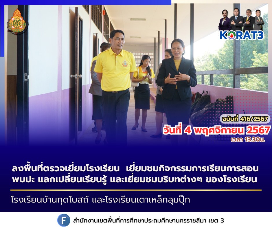 นายดำเนิน เพียรค้า ผู้อำนวยการสำนักงานเขตพื้นที่การศึกษาประถมศึกษานครราชสีมาเขต 3 พร้อมด้วย นางชนิกานต์ โสภาพิศ นางสาวสรารัตน์ ฉลองกลาง ศึกษานิเทศก์ ชำนาญการพิเศษ ลงพื้นที่ตรวจเยี่ยมโรงเรียนบ้านกุดโบสถ์ และโรงเรียนบ้านเตาเหล็ก-ลุมปุ๊ก ได้รับต้อนรับจากผู้บริหารโรงเรียนและคณะครู เยี่ยมชมกิจกรรมการเรียนการสอน พบปะ แลกเปลี่ยนเรียนรู้ และเยี่ยมชมบริบทต่างๆ ของโรงเรียน