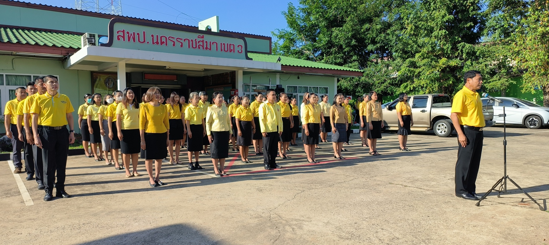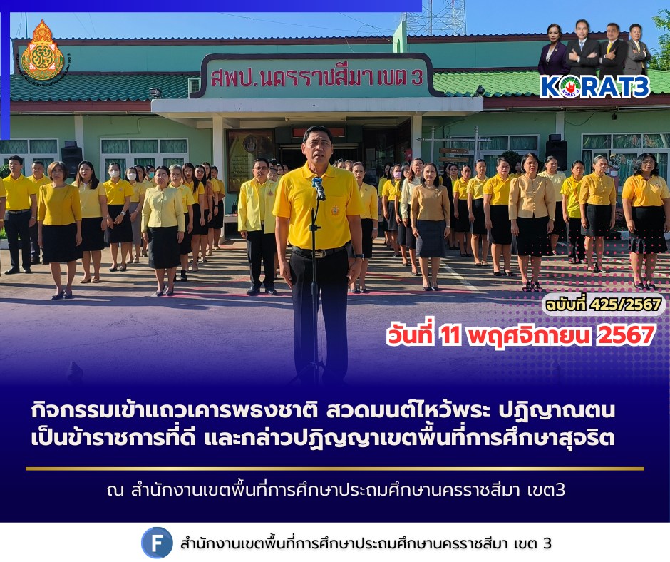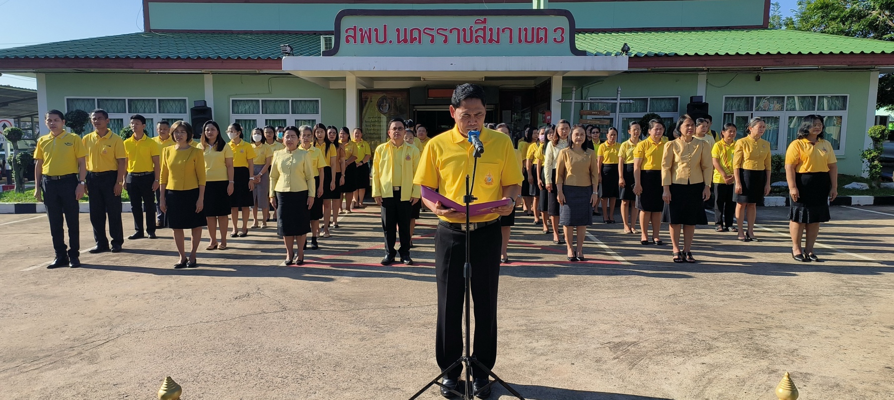 นายดำเนิน เพียรค้า ผู้อำนวยการสำนักงานเขตพื้นที่การศึกษาประถมศึกษานครราชสีมา เขต 3 พร้อมด้วย นายเพิ่มวุธ บุบผามาตะนัง นางสาวมยุรีย์ เนตรศิลานนท์ รองผู้อำนวยการสำนักงานเขตพื้นที่การศึกษาประถมศึกษานครราชสีมา เขต 3 และผู้อำนวยการกลุ่ม/หน่วยข้าราชการ บุคลากรทางการศึกษา และลูกจ้าง ร่วมกิจกรรมเข้าแถวเคารพธงชาติ สวดมนต์ไหว้พระ ปฏิญาณตนเป็นข้าราชการที่ดี และกล่าวปฏิญญาเขตพื้นที่การศึกษาสุจริต พร้อมแจ้ง ข้อราชการ แนวปฏิบัติ เพื่อรับทราบ และถือปฏิบัติร่วมกัน นับเป็นกิจกรรมที่ทางสำนักเขตพื้นที่การศึกษาประถมศึกษานครราชสีมา เขต 3 ได้ดำเนินการอย่างต่อเนื่อง
