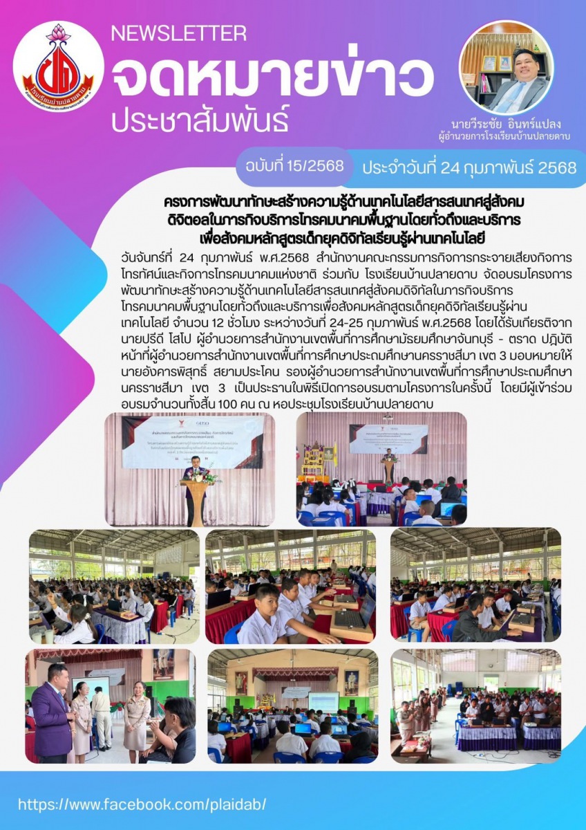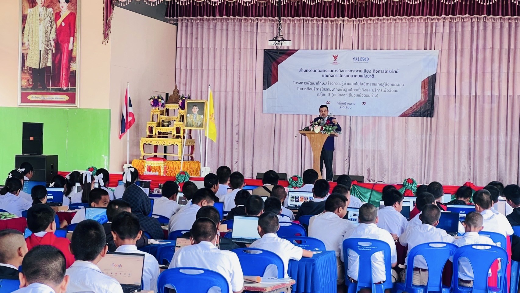 วันที่ 24 กุมภาพันธ์ พ.ศ.2568 นายปรีดี โสโป ผอ.สพม.จันทบุรี – ตราด ปฎิบัติหน้าที่ผอ.สพป.นครราชสีมา เขต 3 มอบหมายให้ นายอังคารพิสุทธิ์ สยามประโคน รองผอ.สพป.นครราชสีมา เขต 3 เป็นประธานในพิธีเปิดการอบรมโครงการพัฒนาทักษะสร้างความรู้ด้านเทคโนโลยีสารสนเทศ สู่สังคมดิจิทัล ในภารกิจบริการโทรคมนาคมพื้นฐานโดยทั่วถึง และบริการเพื่อสังคม หลักสูตรเด็กยุคดิจิทัลเรียนรู้ผ่านเทคโนโลยี จำนวน 12 ชั่วโมง ระหว่างวันที่ 24-25 กุมภาพันธ์ พ.ศ.2568 ตามโครงการในครั้งนี้ โดยมีผู้เข้าร่วมอบรมจำนวนทั้งสิ้น 100 คน ณ หอประชุมโรงเรียนบ้านปลายดาบจัดขึ้นโดย สำนักงานคณะกรรมการกิจการกระจายเสียงกิจการโทรทัศน์และกิจการโทรคมนาคมแห่งชาติ ร่วมกับ โรงเรียนบ้านปลายดาบ อำเภอปักธงชัย จังหวัดนครราชสีมา