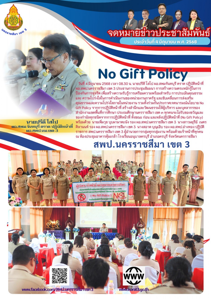 นายปรีดี โสโป ผู้อำนวยการสำนักงานเขตพื้นที่การศึกษามัธยมศึกษาจันทบุรี ตราด ปฏิบัติหน้าที่ผู้อำนวยการสำนักเขตพื้นที่การศึกษาประถมศึกษานครราชสีมา เขต 3 ประธานการสัมมนาการสร้างความตระหนักรู้ในการป้องกันการทุจริต เพื่อสร้างความรับรู้การเตรียมความพร้อมสำหรับการประเมินคุณธรรมและความโปร่งใสในการดำเนินงานของหน่วยงานภาครัฐ และขับเคลื่อนการส่งเสริม คุณธรรมและความโปร่งใสภายในหน่วยงาน รวมทั้งร่วมกันประกาศเจตนารมณ์นโยบาย No Gift Policy จากการปฏิบัติหน้าที่ สร้างสำนึกและวัฒนธรรมให้ผู้บริหาร และบุคลากรของสำนักงานเขตพื้นที่การศึกษา ประถมศึกษานครราชสีมา เขต ๓ ทุกคนจะไม่รับของขวัญและของกำนัลทุกชนิดจากการปฏิบัติหน้าที่ ทั้งขณะ ก่อน และหลังปฏิบัติหน้าที่ (No Gift Policy) พร้อมด้วย