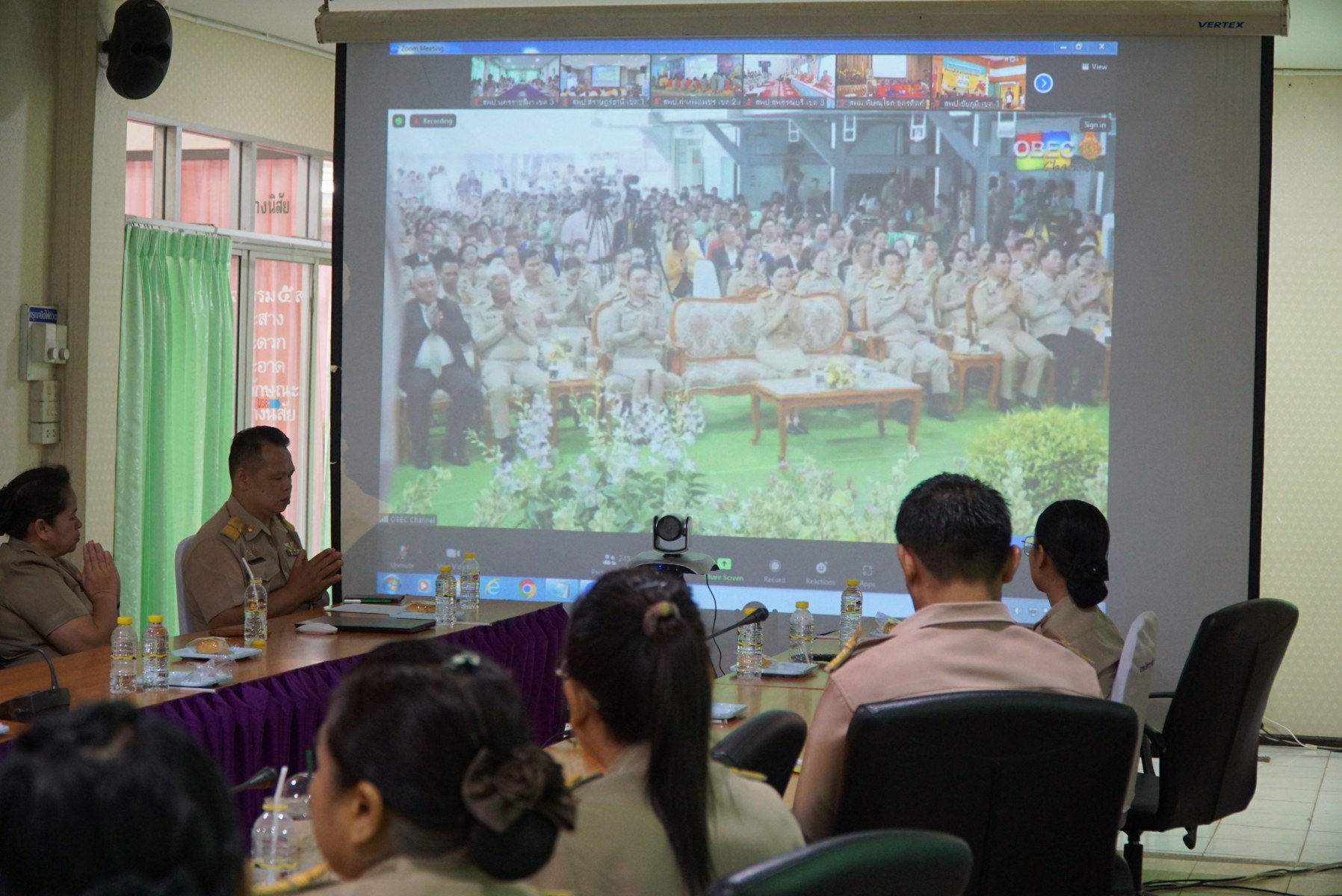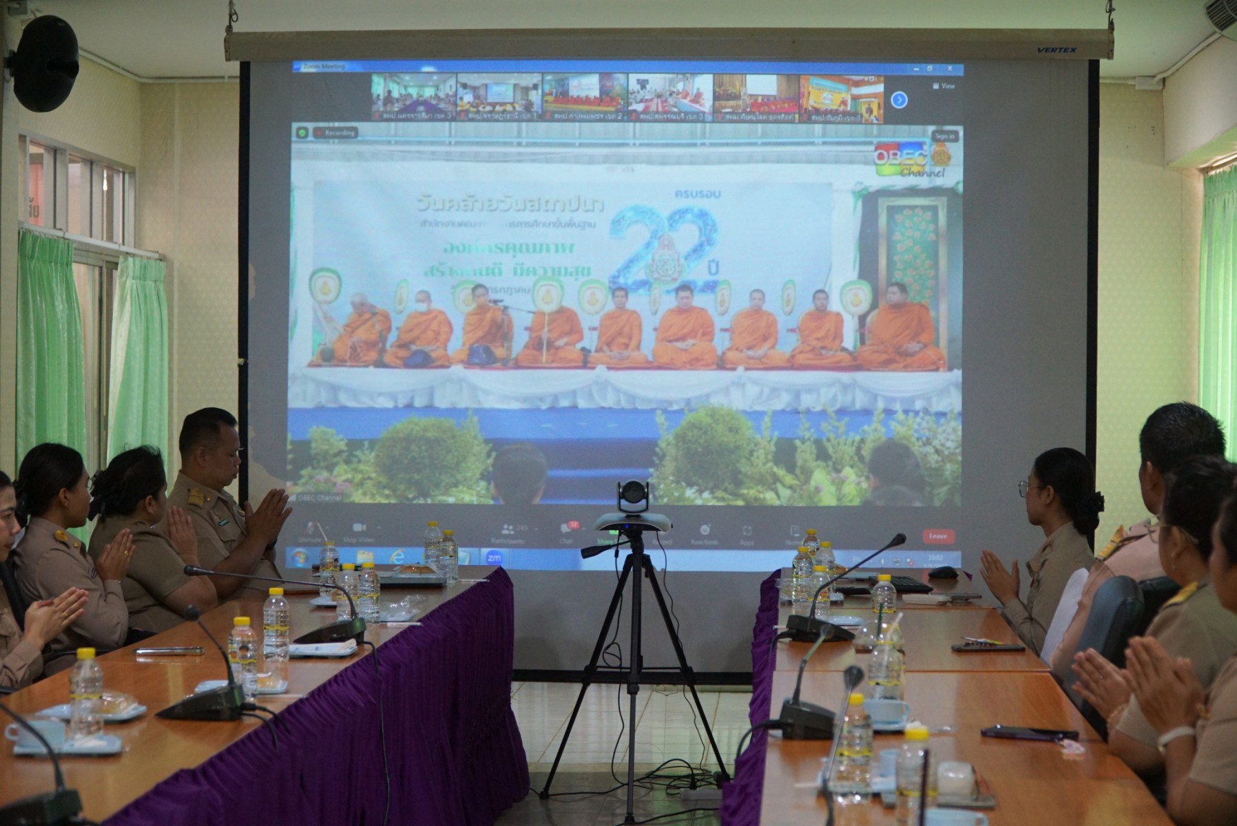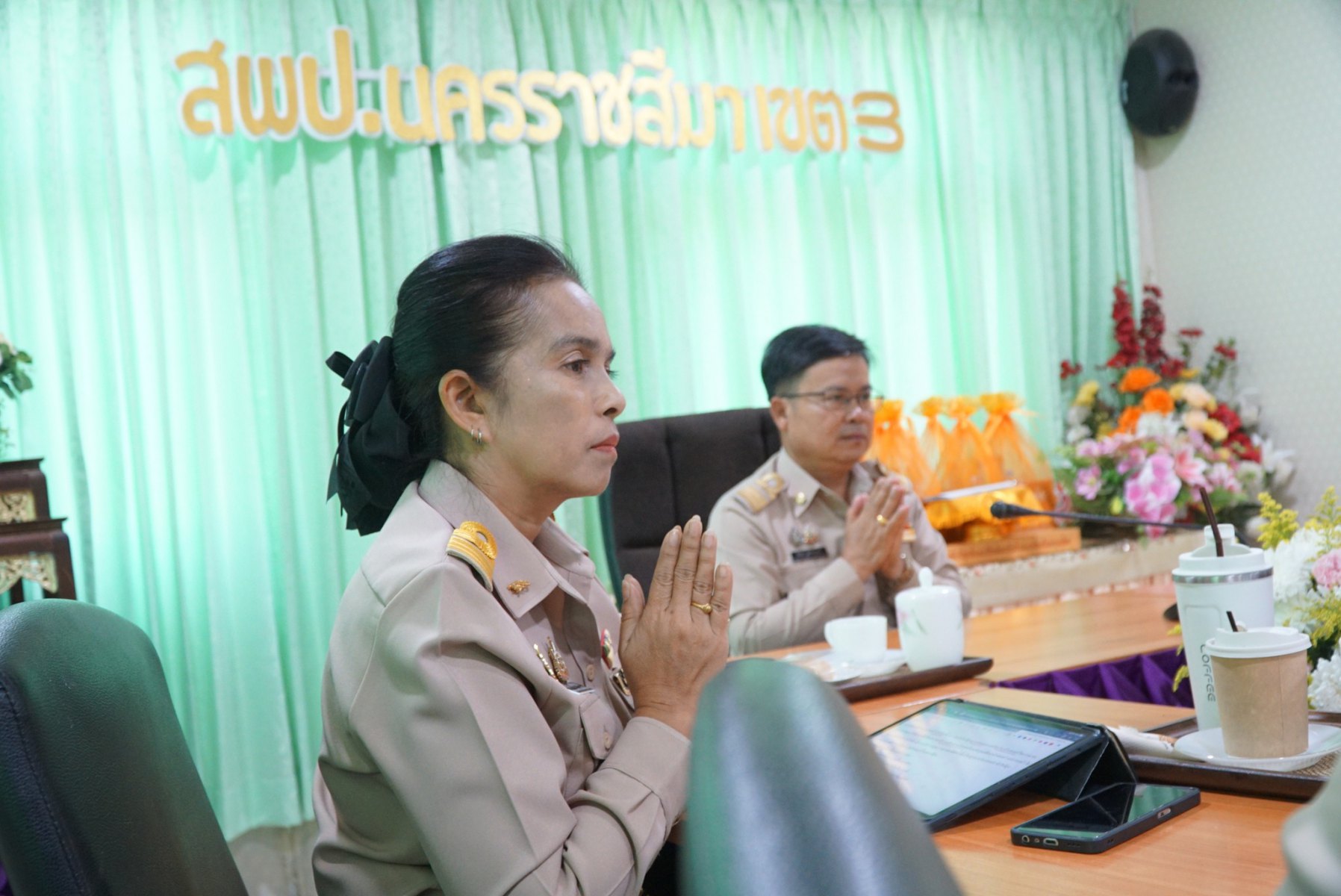 นายปรีดี โสโป ผู้อำนวยการสำนักงานเขตพื้นที่การศึกษามัธยมศึกษาจันทบุรี ตราด ปฏิบัติหน้าที่ผู้อำนวยการสำนักงานเขตพื้นที่การศึกษาประถมศึกษานครราชสีมาเขต 3 มอบหมาย นายเพิ่มวุธ บุบผามาตะนัง รองผู้อำนวยการสำนักงานเขตพื้นที่การศึกษาประถมศึกษานครราชสีมา เขต 3 นางสาวมยุรีย์ เนตรศิลานนท์ รองผู้อำนวยการสำนักงานเขตพื้นที่การศึกษาประถมศึกษานครราชสีมา เขต 3 นางสอาด บุญเอิบ รองผอ.สพป.อ่างทอง ปฏิบัติราชการ สพป.นครราชสีมา เขต3 ผู้อำนวยการกลุ่ม/หน่วย และบุคลากรทางการศึกษา และลูกจ้าง ร่วมรับชมกิจกรรมผ่านระบบออนไลน์ ทำบุญถวายสังฆฐาน เนื่องในกิจกรรมวันคล้ายวันสถาปนา สพฐ. ครบรอบ 22 ปี สพฐ. ณ ห้องประชุมเบญจมาศ สพป.นครราชสีมา เขต3 และวัดสมุทรการแชะ อำเภอครบุรี จังหวัดนครราชสีมา