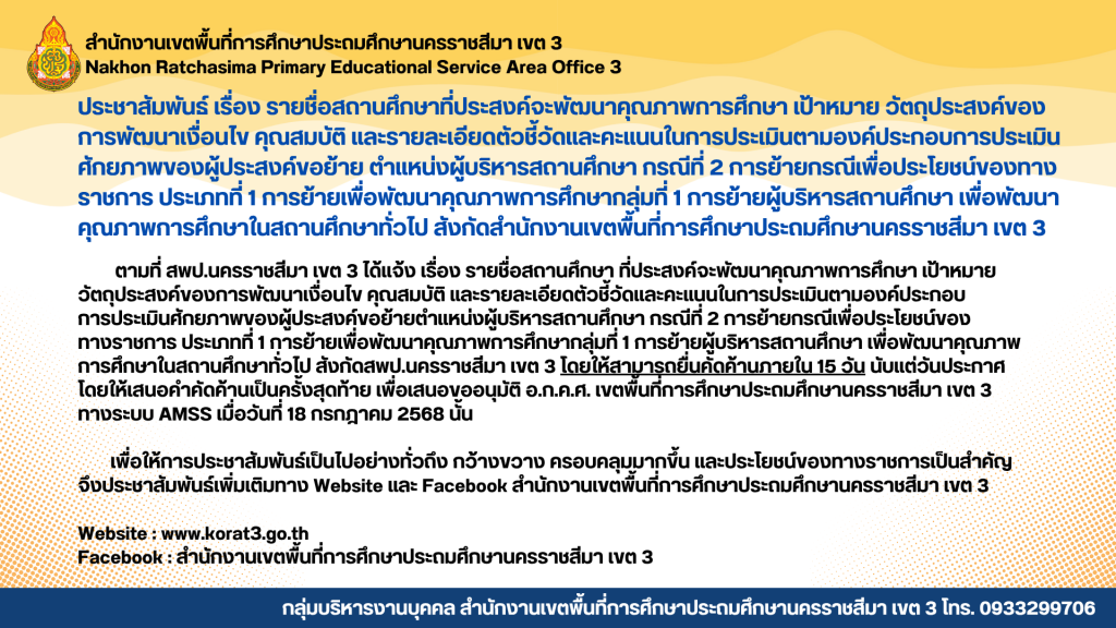Home>>ข่าวประชาสัมพันธ์>>ประกาศ อ.ก.ค.ศ. เขตพื้นที่การศึกษาประถมศึกษานครราชสีมา เขต 3 เรื่อง รายชื่อสถานศึกษาที่ประสงค์จะพัฒนาคุณภาพการศึกษา เป้าหมาย วัตถุประสงค์ของการพัฒนาเงื่อนไข คุณสมบัติ และรายละเอียดตัวชี้วัดและคะแนนในการประเมินตามองค์ประกอบการประเมินศักยภาพของผู้ประสงค์ขอย้าย ตำแหน่งผู้บริหารสถานศึกษา กรณีที่ 2 การย้ายกรณีเพื่อประโยชน์ของทางราชการ ประเภทที่ 1 การย้ายเพื่อพัฒนาคุณภาพการศึกษา กลุ่มที่ 1 การย้ายผู้บริหารสถานศึกษา เพื่อพัฒนาคุณภาพการศึกษาในสถานศึกษาทั่วไปสังกัดสำนักงานเขตพื้นที่การศึกษาประถมศึกษานครราชสีมา เขต 3