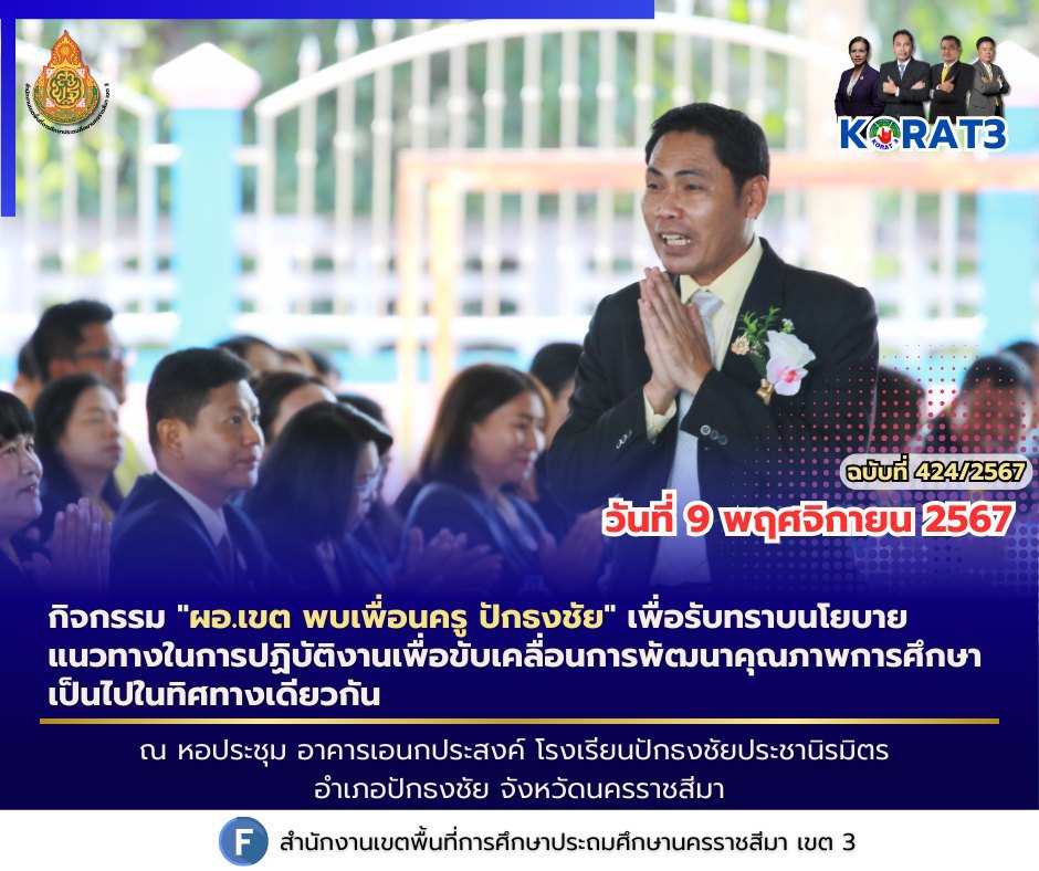 นายดำเนิน เพียรค้า ผู้อำนวยการสำนักงานเขตพื้นที่การศึกษาประถมศึกษานครราชสีมาเขต 3 พร้อมด้วย นายอังคารพิสุทธ์ สยามประโคน นายเพิ่มวุธ บุบผามาตะนัง นางสาวมยุรีย์ เนตรศิลานนท์ รองผู้อำนวยการสำนักงานเขตพื้นที่การศึกษาประถมศึกษานครราชสีมา เขต 3 ผู้อำนวยการกลุ่มงานทุกกลุ่ม ร่วมกิจกรรม “ผอ.เขต พบเพื่อนครู ปักธงชัย” เพื่อรับทราบนโยบาย แนวทางในการปฏิบัติงานเพื่อขับเคลื่อนการพัฒนาคุณภาพการศึกษาเป็นไปในทิศทางเดียวกัน และเตรียมความพร้อมในการเปิดเรียนภาคเรียน ที่ 2/2567 เป็นการสร้างขวัญกําลังใจให้แก่ข้าราชการครู และบุคลากรทางการศึกษาในสังกัดในการปฏิบัติหน้าที่ ณ หอประชุม อาคารเอนกประสงค์ โรงเรียนปักธงชัยประชานิรมิตร จังหวัดนครราชสีมา